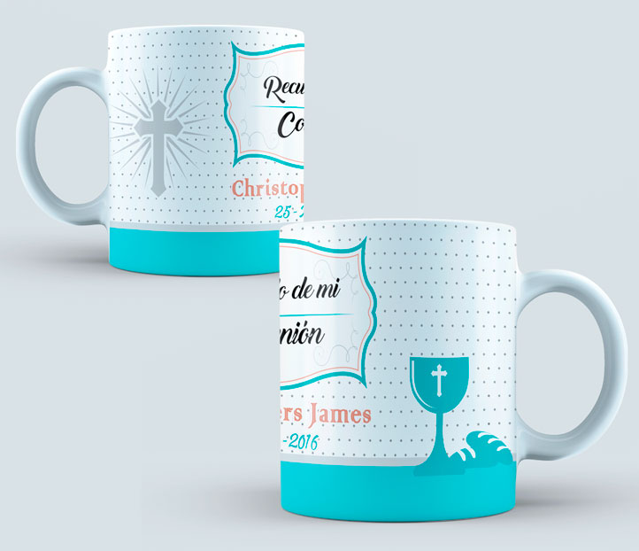 Taza Comunión color rosa y gris, fondo puntitos Contactar por WhatsApp